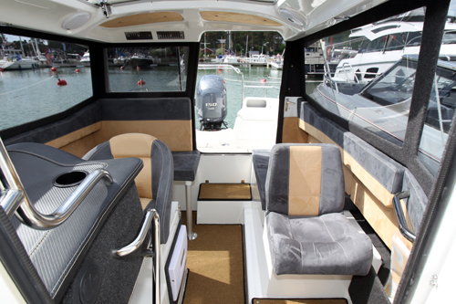 Tilavassa hytissä kippari istuu lähes veneen keskilinjalla. Ohjaamon tiloja sekä hallintalaitteiden sijoittelua on mietitty käyttäjän kannalta tarkkaan. 12-tuumaiselle plotterinäytölle on luonteva paikka kojetaulussa, aivan kuljettajan käden ulottuvissa ilman kurkottelua. Ajamisen aktiiviset hallintalaitteet on keskitetty kuljettajan oikealle puolelle, samoin kaukohallintalaite ja trimmitasojen kytkimet ja hakuvalojen katkaisimet. Ohjaajalle vieressä on myös hyvin säilytystilaa pikkutavaralle.